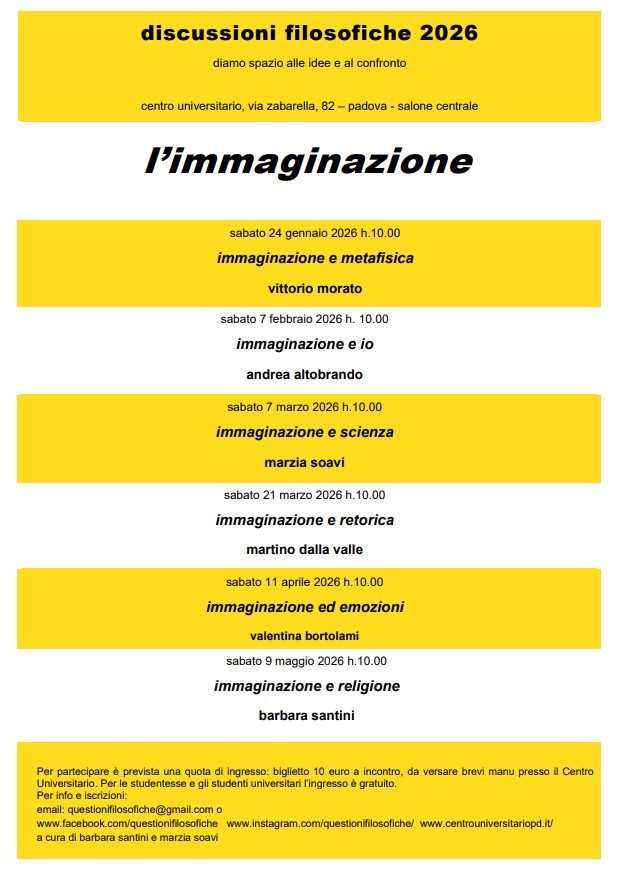 Tornano gli incontri di filosofia al centro universitario, con un nuovo format a cura di Barbara Santini e Marzia Soavi che intende dare spazio a idee di interesse condiviso e a un confronto ricco e stimolante.