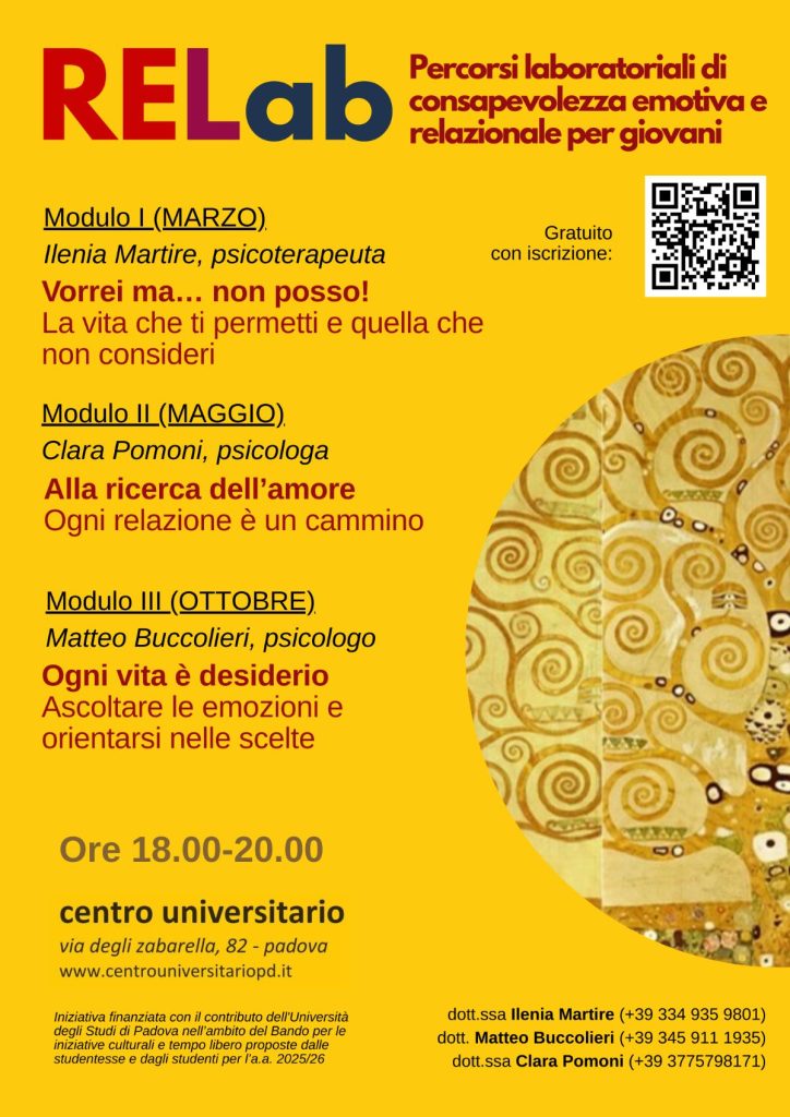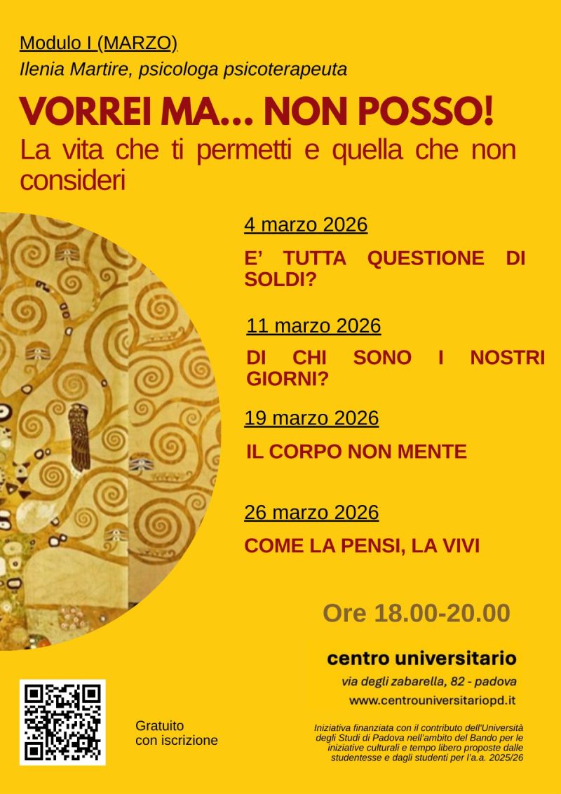 Dove e quando? I tre moduli, ciascuno costituito da 4 incontri, si terranno rispettivamente nei mesi di marzo, maggio e ottobre 2026. Gli incontri avranno durata di circa 2 ore, e si svolgeranno con orario 18.00-20.00 presso i locali del Centro Universitario Padovano, Via degli Zabarella, 82.