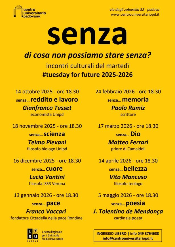 Tra le molteplici proposte culturali e spirituali del Centro Universitario Padovano spiccano i rinomati “martedì culturali”, ribattezzati con acume dai giovani stessi: “Tuesdays for Future”. Questi incontri mensili non sono solo dibattiti, ma percorsi formativi guidati da una parola chiave che funge da filo conduttore annuale. Quest’anno la parola scelta è SENZA. È una parola che sottende una domanda intrigante e provocatoria per il nostro tempo: “Di che cosa oggi non possiamo stare senza?”