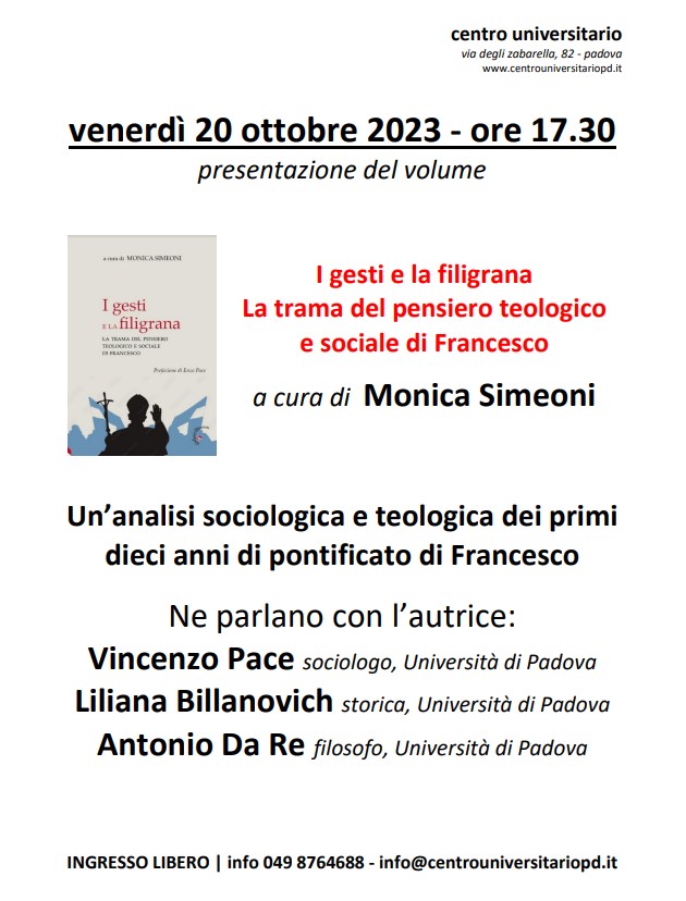 archivio proposte ospitateVenerdì 20 Ottobre - ore 17.30presentazione del volume “I gesti e la filigrana” sul pontificato di Francesco, con l’autrice Monica Simeoni Indietro